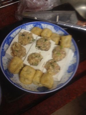 等全都‘酿’好后,置锅,放入油,等油锅七分热,把豆腐正面朝下放下去,要隔不久摆动锅的位置,但途中不可以动豆腐,只能左右移动锅的位置。等煎到能闻到肉香味,有点金黄色,关火放置十五分钟。然后将豆腐翻面继续煎,背面不用煎太久。步骤如上。