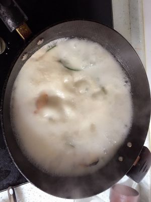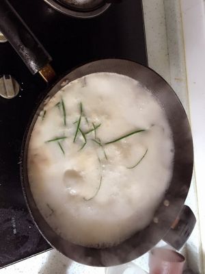 锅中放油 将鱼头 鱼尾巴 骨头杂碎一起放进去煎,放些生姜。注意:煎的时候开始不要翻动锅,开中火 等到一面煎好翻面再煎 等到两面都焦黄一次性加入开水 就成奶白色的汤啦。鱼汤要开盖大火炖,让鱼的腥气散发出去,汤里加入香葱 生姜 泡椒 根据口味加入辣椒皮,等汤熬至有一定厚度,稍许粘稠的时候