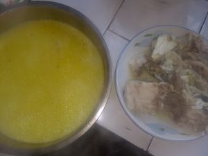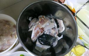 鱼洗净后将鱼肢解好,解成鱼肉、鱼皮、鱼骨、鱼尾,鱼头,鱼肉待放,把其他的鱼头骨尾皮洗净血污备用