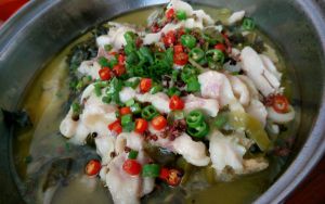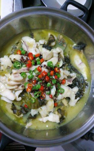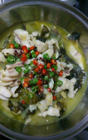 锅里放油,加入花椒生姜爆香,然后加入酸菜,把酸菜炒熟后倒入刚才的鱼汤,锅中煮沸后倒入腌制好的鱼片,大火煮五分钟,期间加入盐,料酒,辣椒,白糖,醋,等调料。