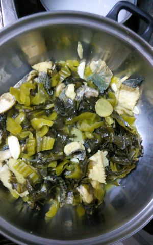 熬鱼汤的同时,可以把酸菜洗干净,切段,并沥干水分(我这个是舅妈给的,她给我的时候已经切好了,所以不用像图片上的切的那么细)。