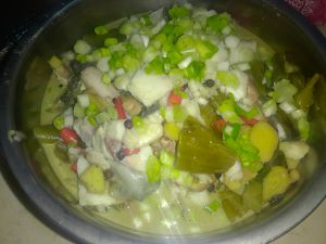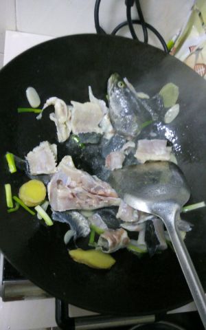 锅里放油加入葱姜蒜翻炒几下,然后放入鱼头骨尾等炒一会