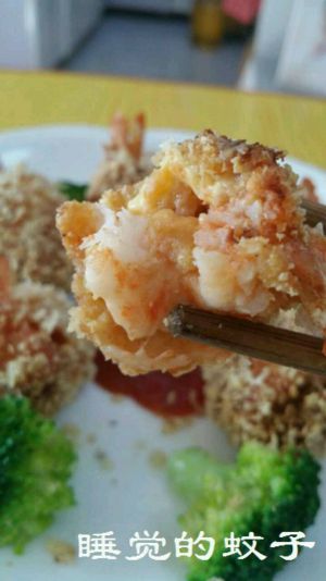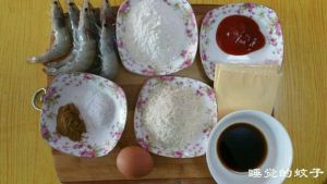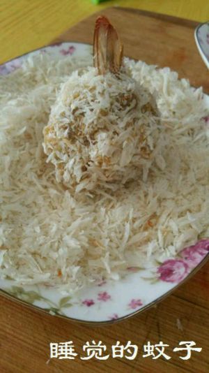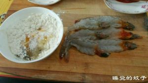 然后准备好面粉、鸡蛋液、面包糠,把最好的虾球分别沾上面粉、蛋液、面包糠