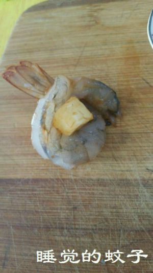 把虾从虾背切开,不要切到底,留一点连接,如图