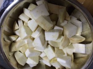 土豆片、茄子块过油炸,炸的稍微久一点,记得炸之前用手把茄子中的水拧出来!