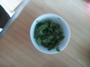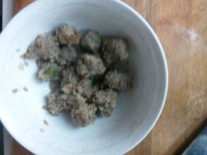 四季豆放入锅内煸炒;(请大家自动忽略锅里的小碎肉,那是昨天出去吃涮锅时打包带回来的一点点儿羊肉,不想浪费所以切碎一起炒了)