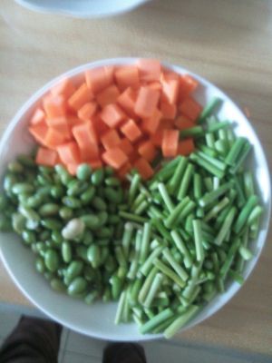 木耳泡水备用;四季豆切断备用;大白菜洗净沥水备用;魔芋切片备用;