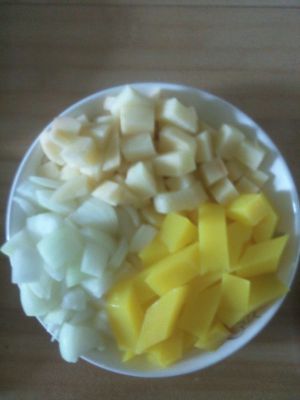 土豆去皮切块,茄子切块,豆角去老筋掰断,洋葱切丝,腊肠切片,葱姜切好。