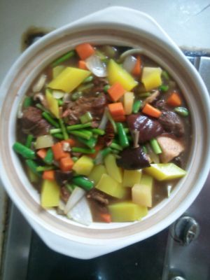 然后下入土豆块 红薯块 玉米段 冻豆腐块 西红柿块 豆角 注意水要和食材平行
