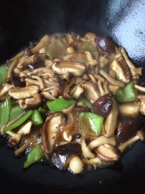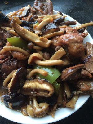 香菇青椒切片儿备用。油热之后倒入少许十三香,翻炒两下,接着倒入各种蘑菇和青椒。翻炒后出水了,所以炖到多半熟,把中午剩下的炖鸡倒入蘑菇里。