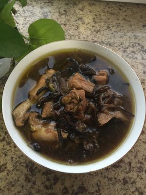 一次性加足开水和留好的泡蘑菇水,加入参大火烧开炖15分钟,转文火炖40分钟