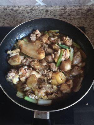 葱切段,姜切片爆锅,放大料,鸡肉翻炒至金黄,加白糖和海鲜酱油翻炒上色