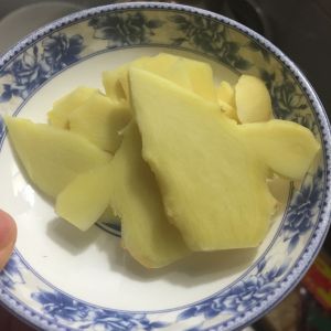 把包菜洗干净后撕成小块free stlye。蒜切片,干辣椒切段