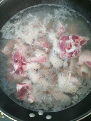 锅内加水烧开,放入猪骨和4片姜,用大火煮去猪骨的血水,捞出备用。