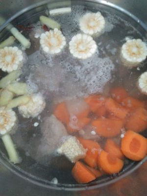 将排骨,胡萝卜,玉米下锅,加入葱段,姜片,加入盐,大约炖一个半小时