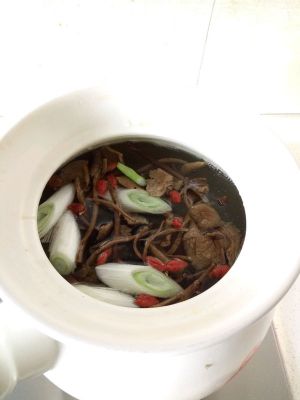 把姜片,葱段,枸杞,茶树菇,排骨放入锅中。锅中加的是凉水。我建议就是多加点水。因为炖汤中间加水,我觉得会影响口感。这里我用的是瓦罐。我觉得这样炖汤比较好喝。大火煮开后,用小火慢炖。