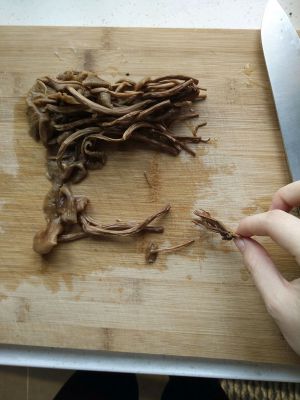茶树菇用温水泡30分钟,然后把根部切掉。