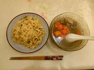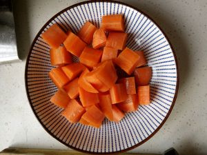 胡萝卜切成块放入盘中备用。等到汤大概炖一个小时的时候放入胡萝卜。然后继续小火慢炖大概四十分钟。