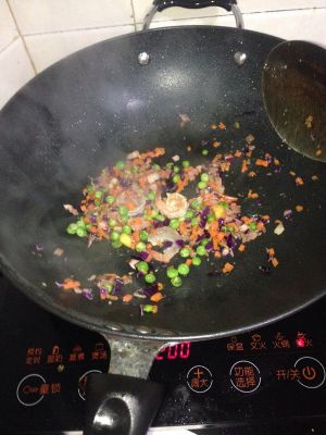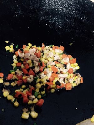 另起油锅下青豆、玉米、胡萝卜、虾仁翻炒3分钟