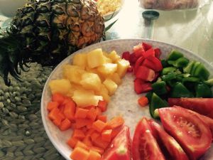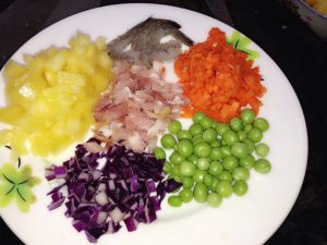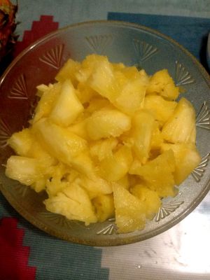 所有材料都在这里了。大家根据个人口味多放少放。对了,菠萝用盐水泡过,其实也不用。呵呵。