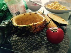 将菠萝挖空,皮不要太薄,底部修整一下使菠萝碗能够放平。