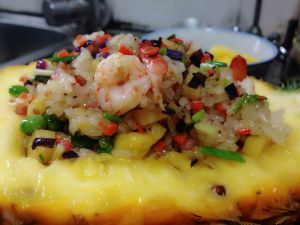 高高火爆炒香菇,葱花,依次加入胡萝卜,玉米,鸡肉,虾仁加盐翻炒5min,最后再加入菠萝和米饭,黑胡椒,蚝油调味(还可以加炒蛋更加美味哦)