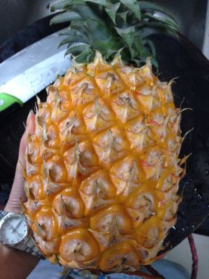 根据人数挑选一个合适的菠萝,洗干净后沿着菠萝头下面三厘米左右切断