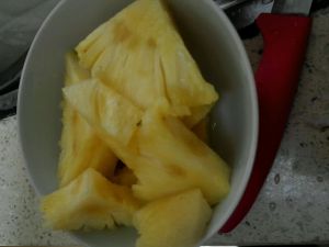 挖下来的菠萝切小粒,菠萝水也一并倒出