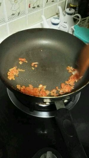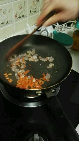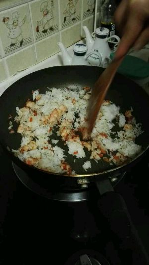 锅里放少量油,适量葱花,放玉米粒青豆,翻炒。倒入米饭菠萝翻炒。