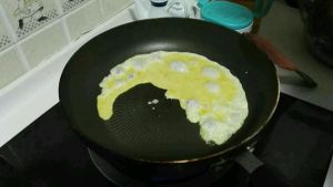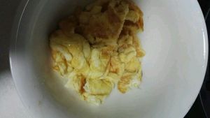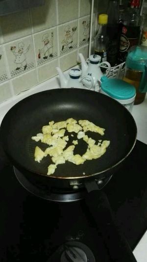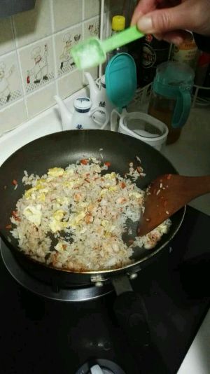 饭炒散,加入开始煎好的鸡蛋,放适量盐,撒多些葱花