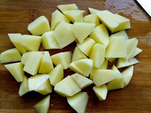 将煮好的土豆去皮,切成小块(大小适中,比较好入味)待用