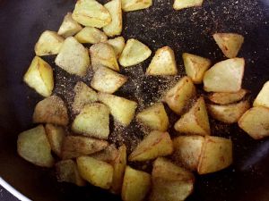 另起一个干净的锅,土豆块倒入锅里,撒些椒盐,孜然粉和辣椒粉翻炒几下,这样炒出来味道更香