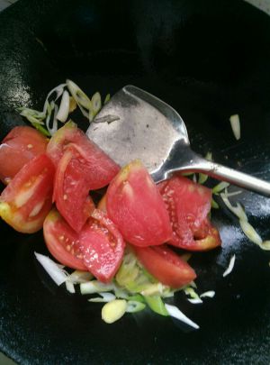 爆出香味后,放入西红柿。