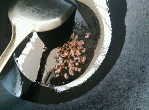 倒油,微热时放入花椒,爆出香味后捞出。(如果觉得麻烦,可以不用捞出来的~)