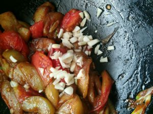 西红柿炒至断生,放入茄子,加入生抽老抽,待西红柿汁裹住茄子,加入蒜,搅拌一下。(这个时候可以加入水淀粉,但是我炒到这一步,汤汁已经挺浓稠啦,就没放水淀粉啦~)