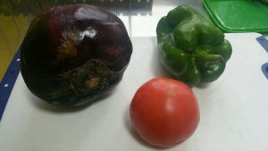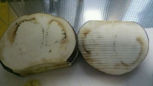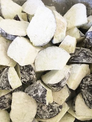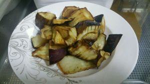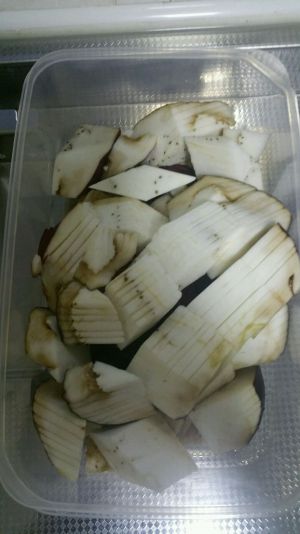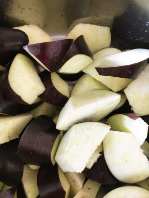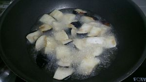 放入足够的油,把茄子(削皮)切块放进去炸。待茄子变软变色后捞出。