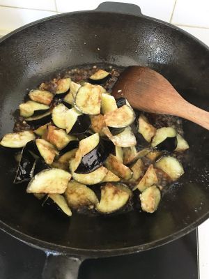 开始领起锅,把葱姜蒜爆香!八角随意。然后把煎好的茄子放入锅里翻炒
