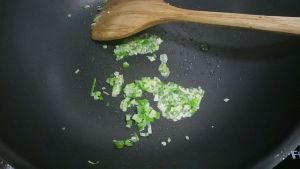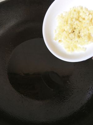 倒入少量的油,放入五香粉,把茄子放进去,放入蒜末爆香。
