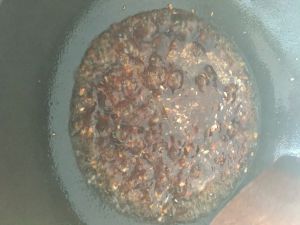 翻炒均匀后,把剩余的面糊加水,倒入锅里。盖过茄子。如果剩的面糊不多也没有关系。多加点水。大火烧开,转小火炖。中间要多翻炒。要不然会粘锅!因为是面糊。