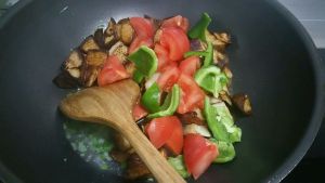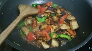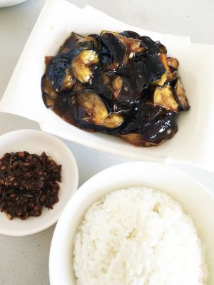 让后锅底倒油把葱,蒜,西红柿,放入锅中煸炒,再放入姜粉,花椒粉,生抽,老抽,耗油,白糖,少许醋让后倒入适量的水,把过油的茄子块放入锅中炖十分钟左右。