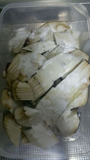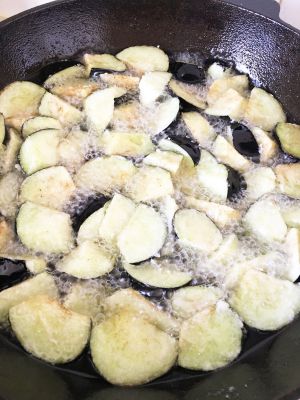 把茄子放进面糊里,一定要双面都沾满面糊,然后放进平底锅里面煎!
