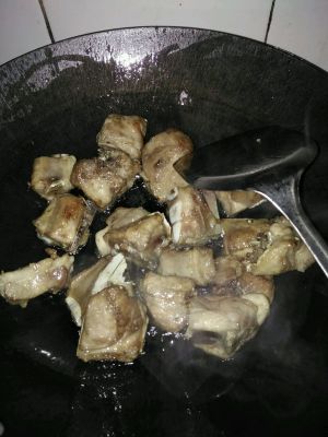 炒锅下入适量油,70℃下排骨姜翻炒,炒到略变色,排骨炒一下会更香