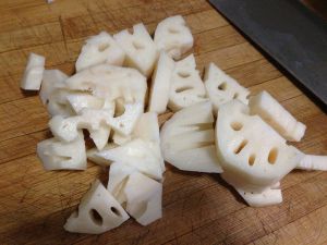 大火至汤滚后小火炖20分钟,倒入莲藕