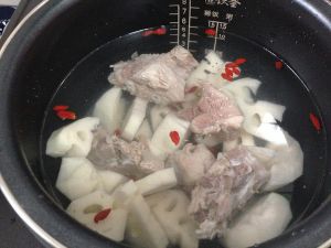 将排骨、莲藕和枸杞放进九阳铁釜电饭煲中;
