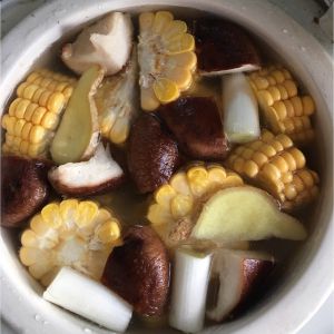 排骨洗净,炒水,水煮开了关火!将排骨放在底层,依次放入玉米香菇葱段姜片,加入水,水要一次加够!放入电炖锅里!等待出锅