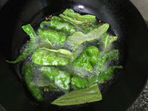 锅里多放些油烧热8到9成,下青椒炸至出现虎皮斑,淋去油。