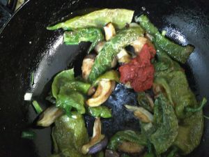炸完茄子的油倒出,留底油,下葱花煸香,倒入青红椒 西红柿煸炒,再下入茄子翻炒,用酱油调色,加入精盐 白糖 米醋 及少量开水,烧开后调好口味,撒少量鸡粉,水淀粉勾芡,撒蒜末出锅。