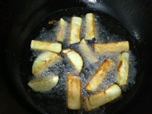 茄子去皮,滚刀切块,锅中油热,下入茄子过油炸一下。