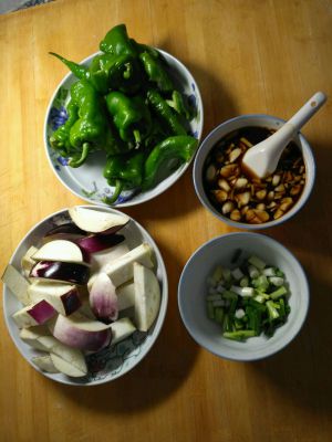水淀粉内调生抽,醋,糖,耗油,少量盐,蒜拍碎放到芡汁里。青椒圆茄子改刀前用纸巾擦干表面水分,青椒破成一半,圆茄子切大长条。野葱切段。