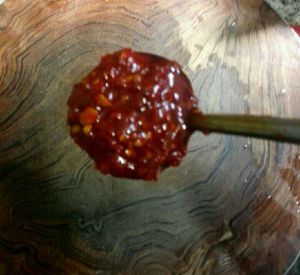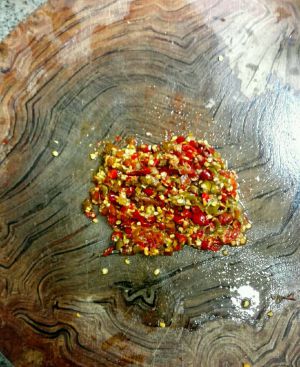 放下一汤勺的郫县豆瓣酱,然后倒入小红辣椒,小火翻炒至豆瓣酱变色,再放下番茄酱,翻炒均匀。